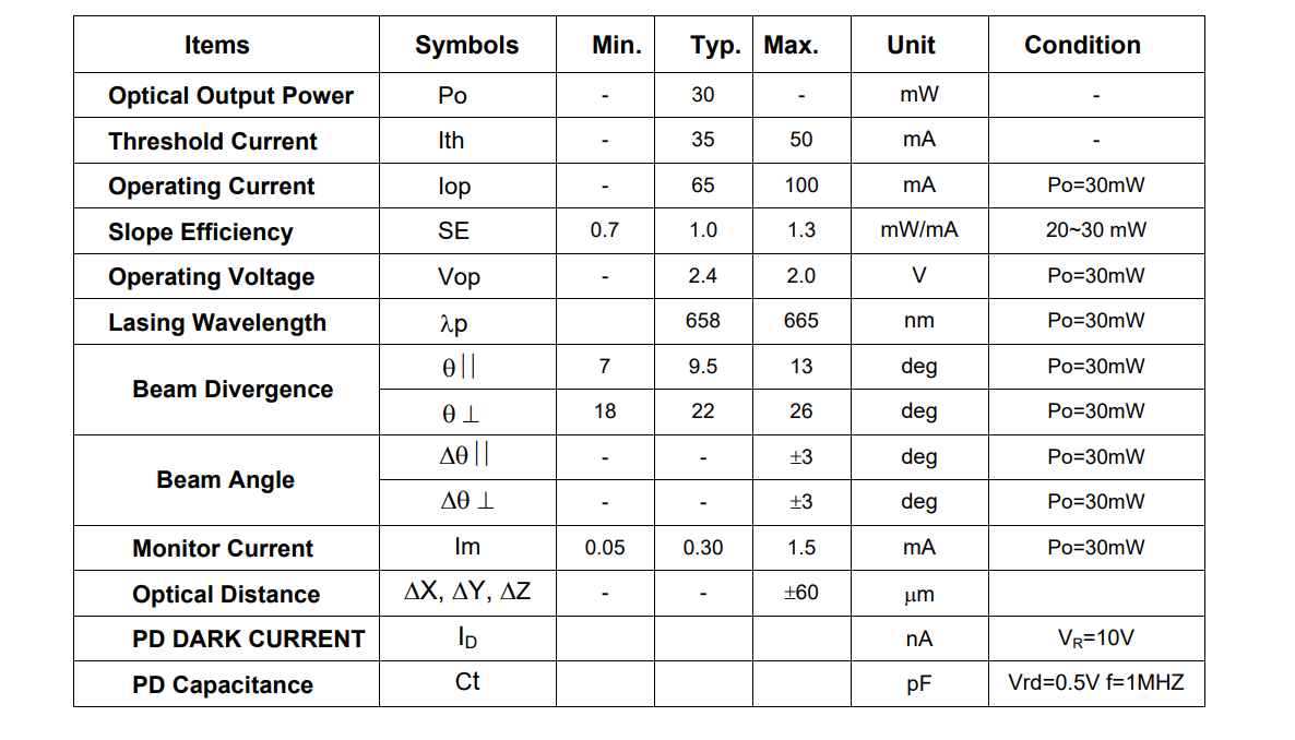 It's an attractive light source, with a typical light output power of 30mW for optoelectronic devices such as DVD-R/+R, DVD-Recorder, High Speed DVD-player and Inderstrial Bar Code Scanner.